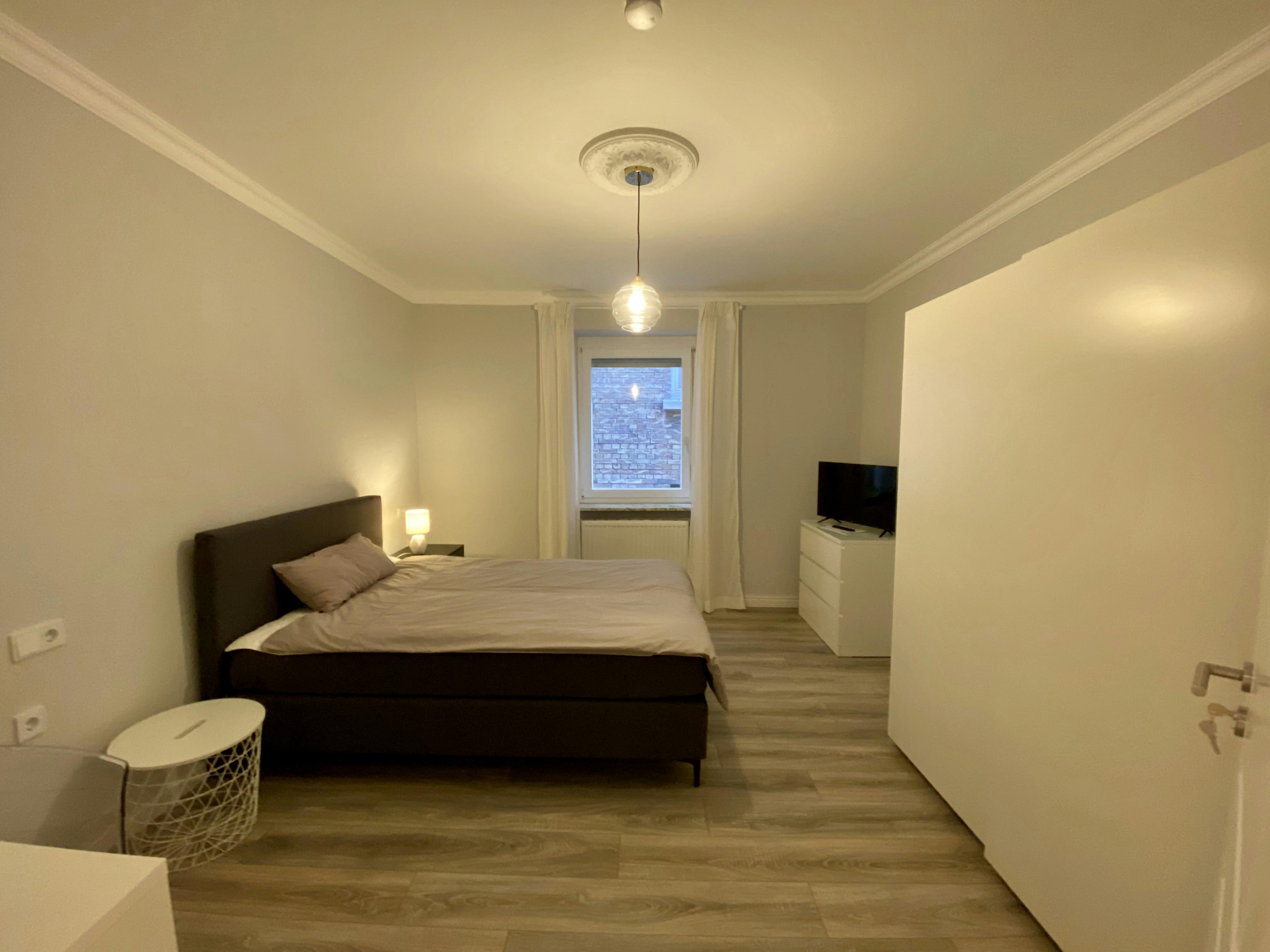 Spacious room in a vibrant area! The 14sqm room is in an 86sqm beautiful, newly renovated old building. The room is fully furnished (one box spring bed 140x200, a duvet 155x200, a duvet 135x200, bedclothes and towels, curtains, an armchair, a closet, and a chest of drawers to store all your belongings. As well as a desk, a desk chair, and a Smart TV) and the room invites you to study, work, relax, unwind ... just live. The bathroom, spacious kitchen, and balcony are shared with two other people. The kitchen is fully equipped with glasses, cups, plates, cutlery, pots, and pans....